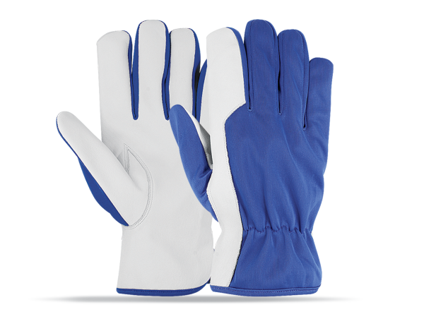 Leather: Goat / Sheepskins leather Colour: Natural Thumb: Straight Thumb Additional: Blue colour cotton knitted wrist cuff