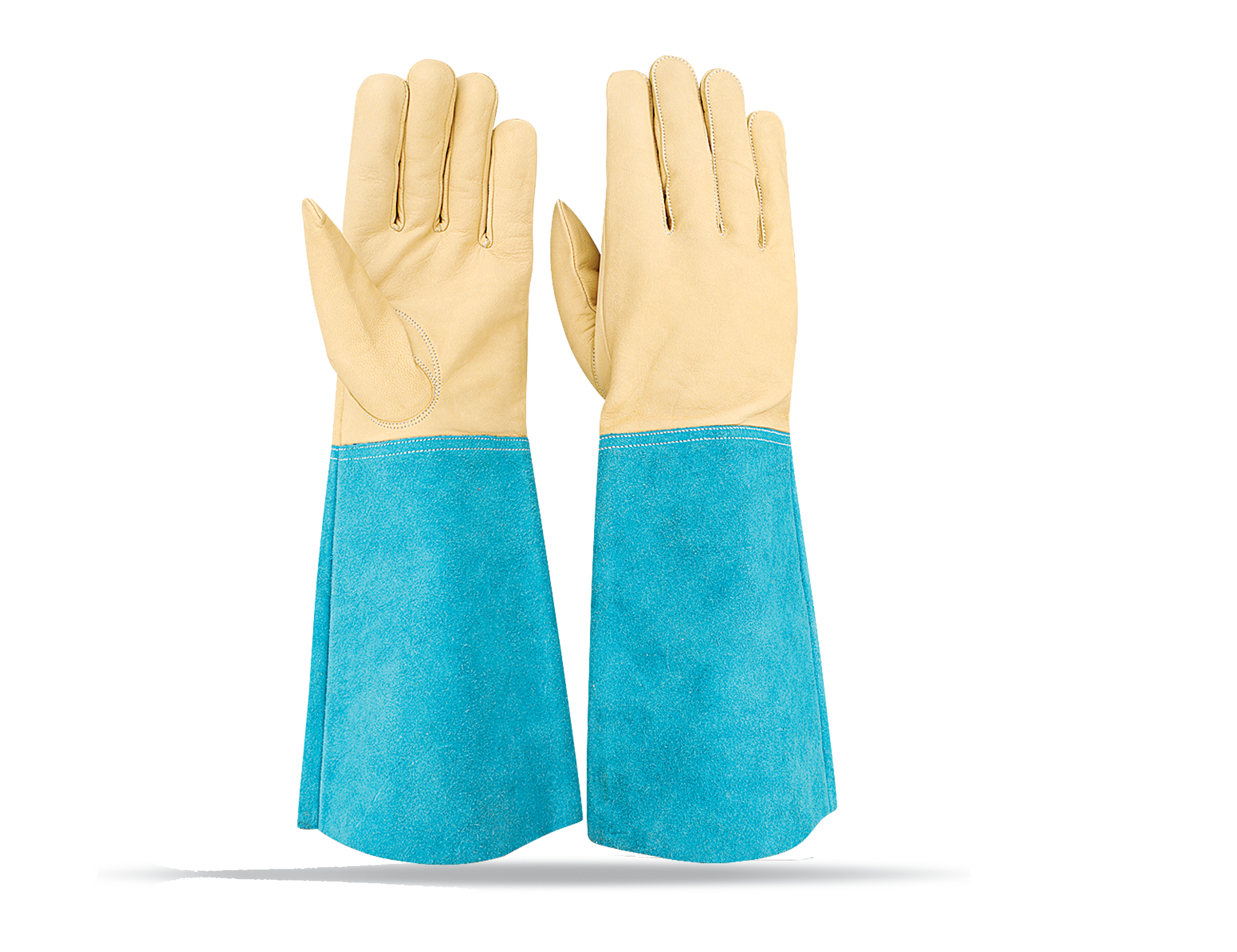 Leather: Goatskin leather wather dying Colour: Beige Thumb: Keystone thumb Cuff: 21 cm turquoise cow split leather Additional: side wall finger