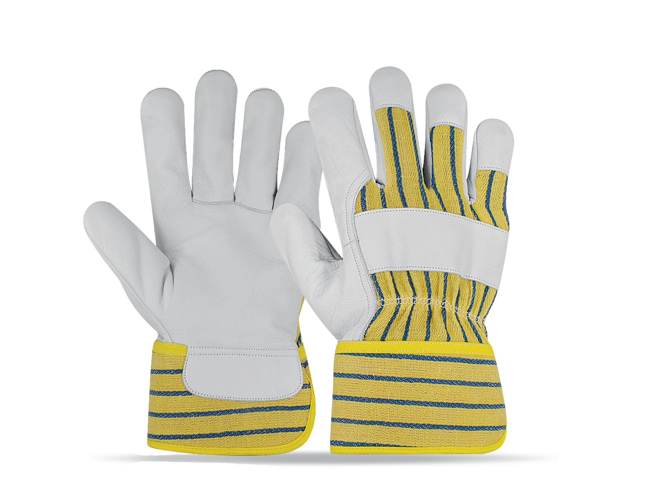Leather: Cow grain leather Color: Natural Thumb: Wing thumb Material: Cotton drill back and rubberize Additional Cuff: Inside half fleece lining shirred elastic inside back Additional: Index finger three fingers tip Knuckle protection on back Size: 8, 9, 10, 11