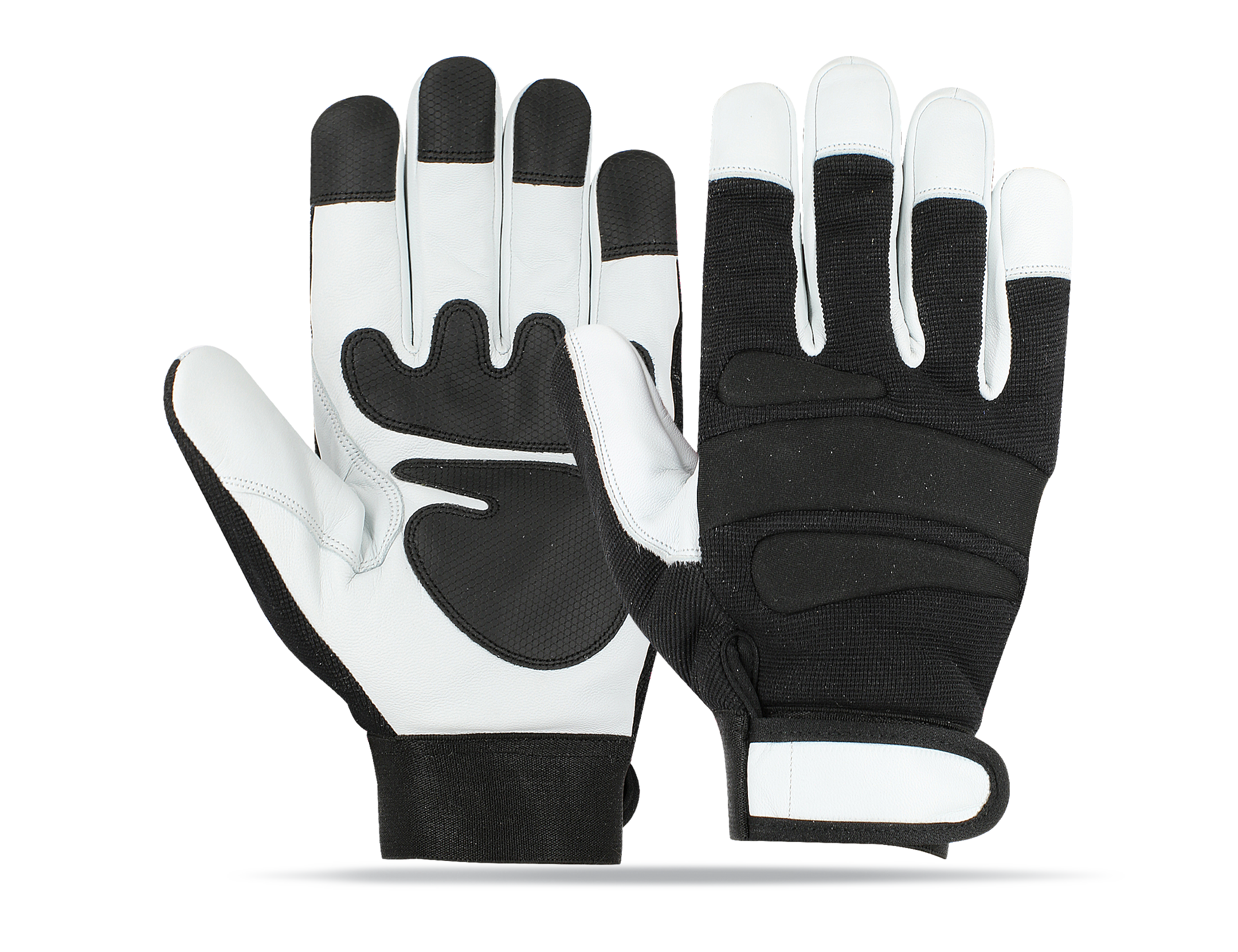 Additional: Elasticated cuff / Velcro tape Re-inforced palm padded 4 fingers leather tip.