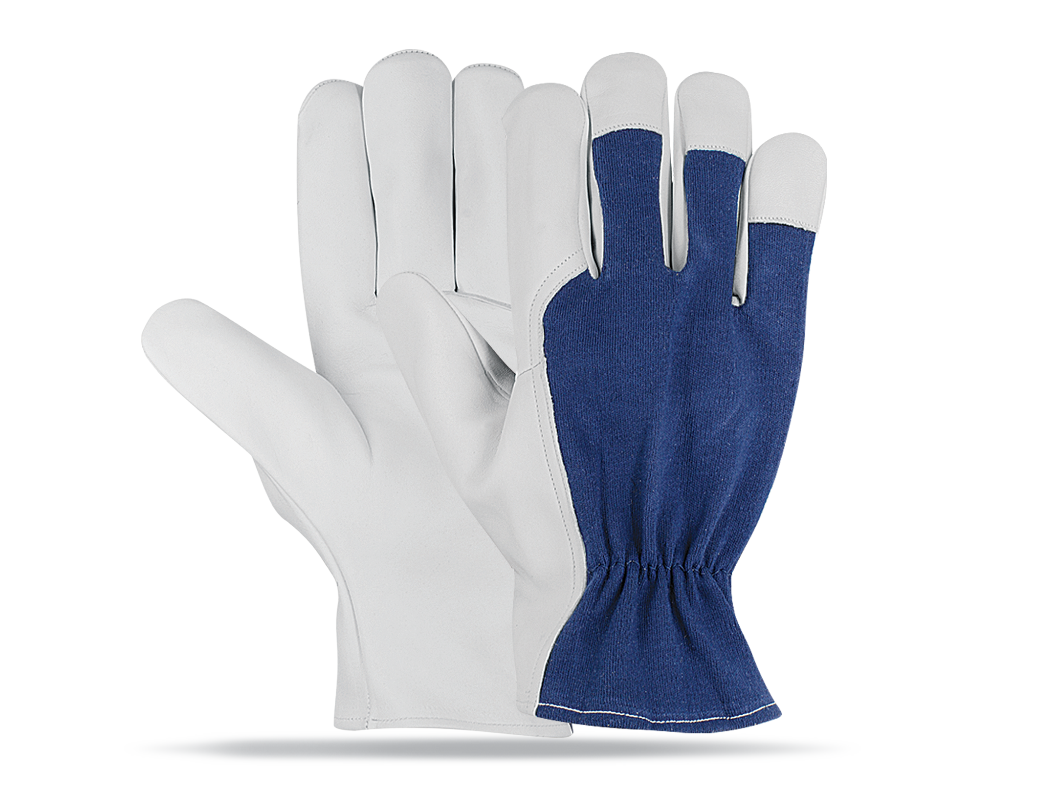 Leather: Goatskin / Sheepskin leather  Colour: Natural Thumb: Wing thumb, full index figner,  three fingers leather tip Additional: blue colour cotton interlock back shirred elastic back